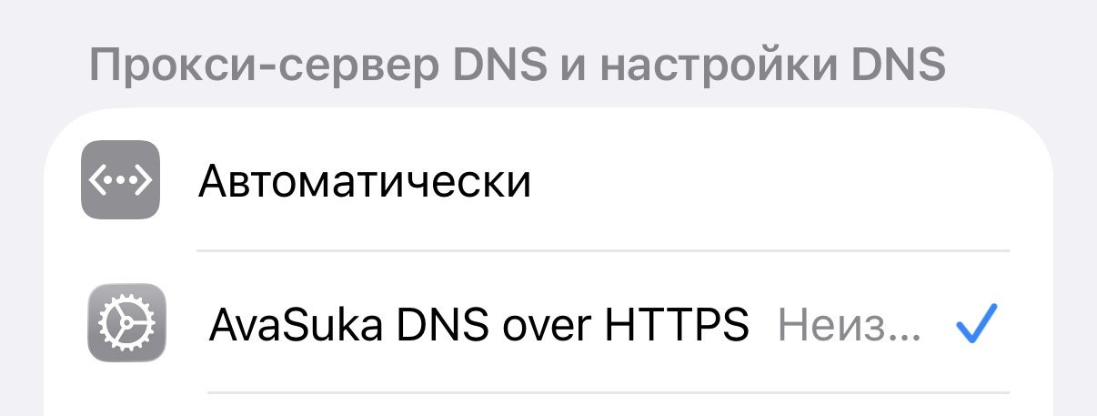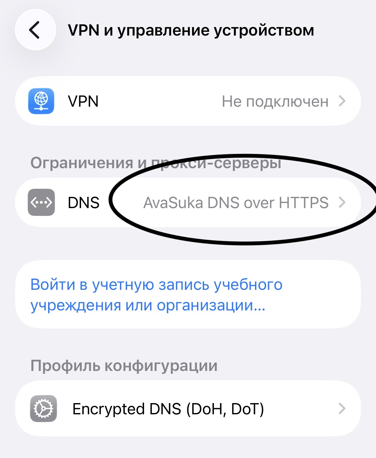 Готово! Вы попадёте в разделе VPN и управление устройствами. Убедитесь, что этот раздел выглядит примерно так (скриншот ниже), а самое главное - во вкладке DNS выбрано "AvaSuka DNS Over HTTPS" (как на скрине).